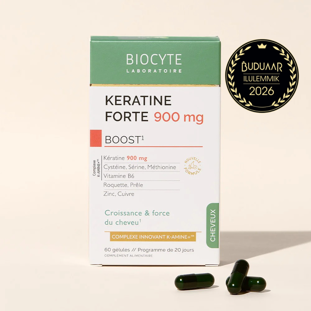Biocyte Keratine Forte Boost koostisesse kuuluvad keratiin, aminohapped, põldosi, rukola, vitamiinid (B3, B5, B6 & B7) ja mineraalid (tsink, vask).
